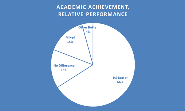 Studies by many different scholars from over 30 years of research on homeschool students’ academic achievement show that 62% (15 of 24) of peer-reviewed and/or representative-sample studies have revealed a positive effect for the homeschooled students compared to institutionally schooled students, while a few studies have shown mixed or negative results (Ray, Hoelzle, & Pietersma, 2026; Ray, 2017). Neither scholars nor homeschooling advocates claim that home-educated students always academically excel others or that research has settled the question of whether homeschooling generally causes students to perform better.