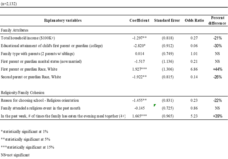 Also, “family cohesion” binary variables are included, In the Past Week, Number of Times the Family Has Eaten the Evening Meal Together (4+ Times); Family Attended a Religious Event in The Past Month, a “religiosity” variable that captures whether or not the family has attended any religious function within the past 30 days.
